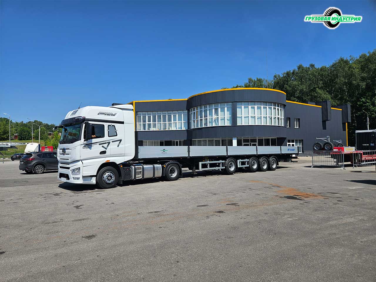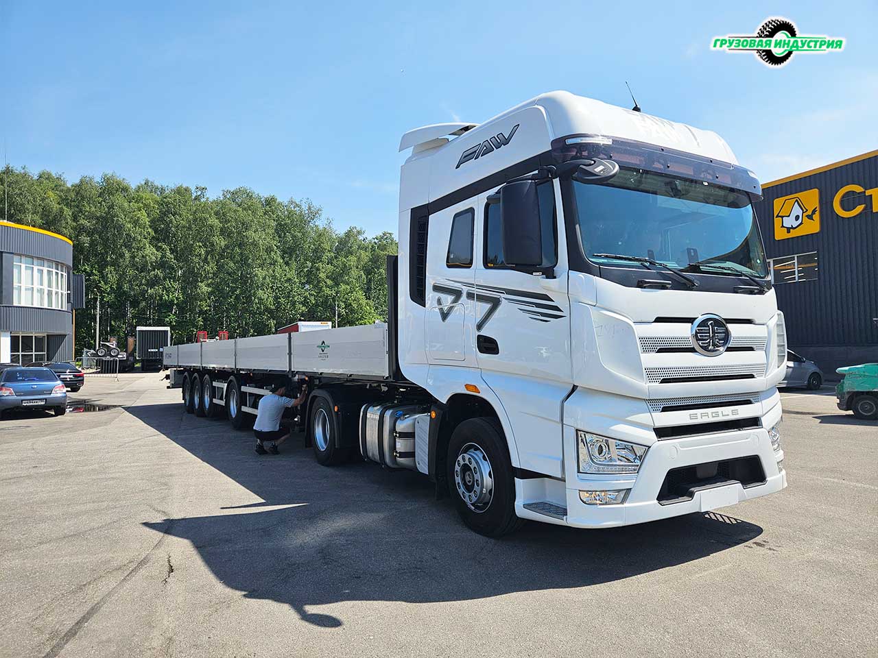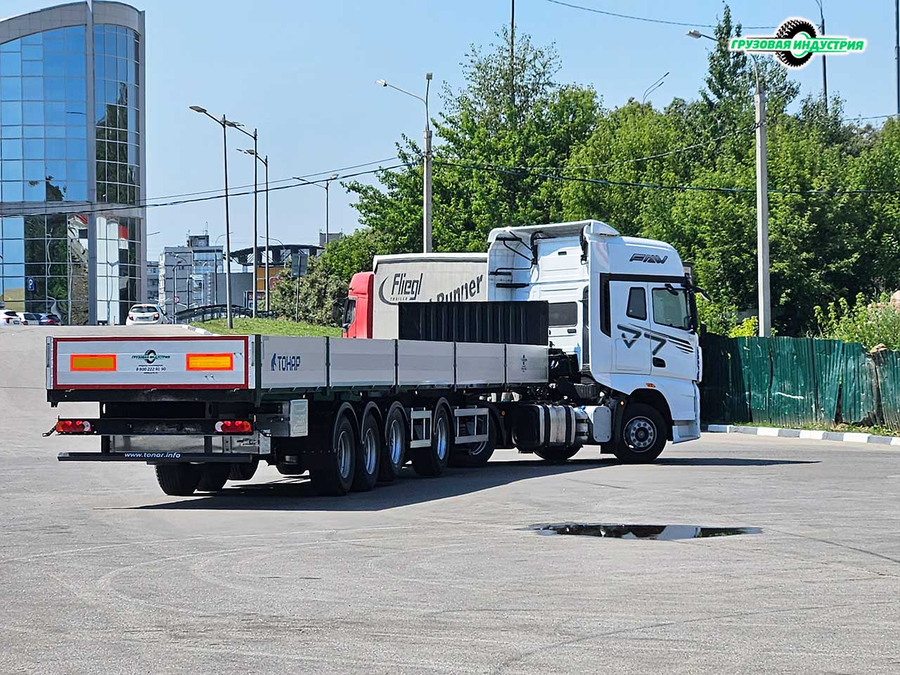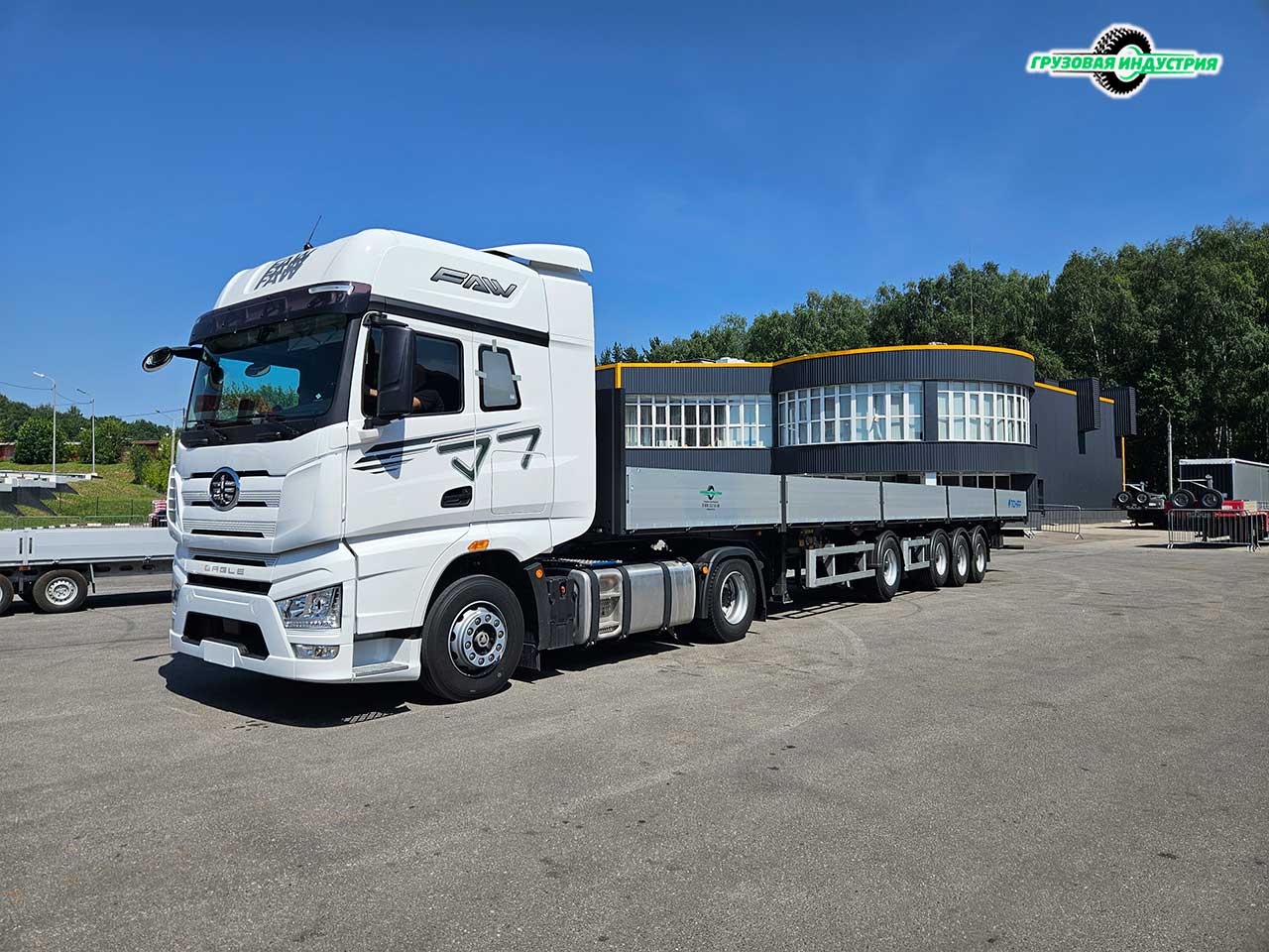 Отгрузка сцепки тягач FAW Eagle H7 4x2 и полуприцепа бортовая платформа Тонар B4-16VK в Москву 4 июля 2024г.